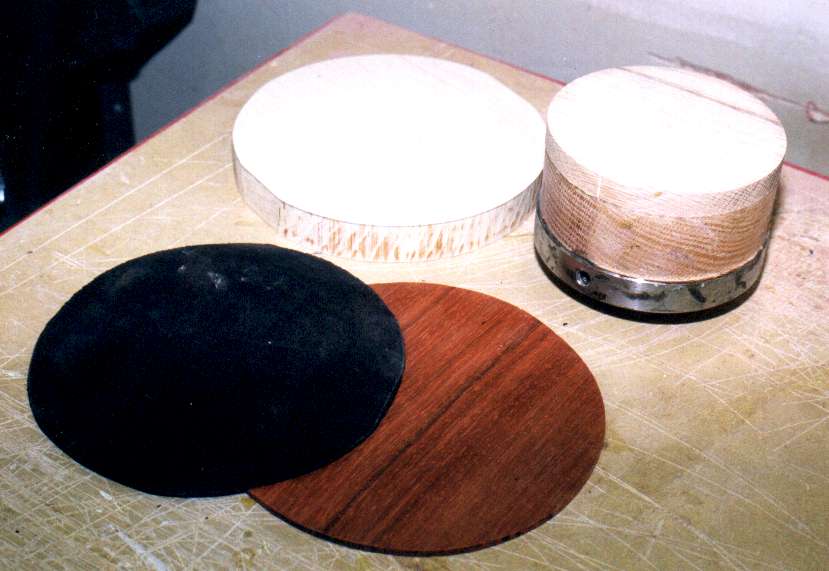 new bowl's base disk and disks of padauk and blackwood are ready to be